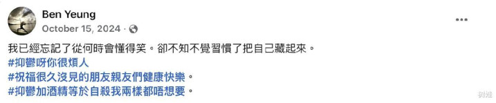 杨尚斌离世的消息来得很突然,之前并没有听闻他患上了什么恶疾,不过在2024年的时候,他曾在社交平台上很隐晦地透露自己饱受抑郁症的困扰。当时他留言称“我已经忘记了从何时会懂得笑,却不知不觉习惯了把自己藏起来。抑郁呀你很烦人,祝福很久没见的朋友亲友们健康快乐。抑郁加酒精等于自杀,我两样都不想要。”从他的发文来看,他应该是患上了抑郁症,同时还依赖酒精,显得很痛苦,所以借发文抒发情感,但之后就再无消息,如今突发离世的消息,是否与抑郁有关,不得而知。