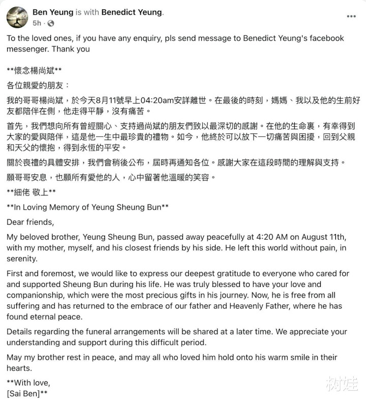 在杨尚斌的社交平台上,最后一则消息则是他的噩耗。文章内容透露了杨尚斌在8月11日凌晨4点20分安详离世,在其生命最后的时刻,杨尚斌的母亲、弟弟以及生前好友都陪伴在左右,他走得平静,没有痛苦。不过内容没有透露杨尚斌因何事而离开。在内容的最后一段还谈及了丧礼的安排,家人还在商讨具体的事宜,之后会公开。文章是杨尚斌的弟弟代笔,以中文两双语的内容呈现。