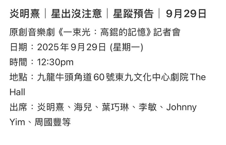 近日再有消息传出,指炎明熹将于下星期现身,疑似复出出席今年 11 月举办的原创粤语音乐剧《一束光:高锟的记忆》的记者会。