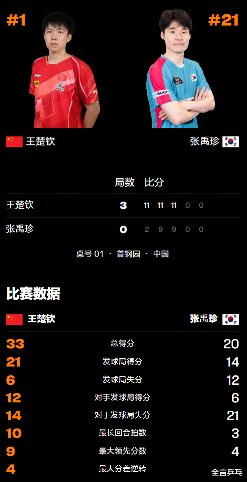 第三局已无退路的张禹珍上来就正手爆冲搏杀得分,但王楚钦依旧沉着冷静应战,在2-6追至4-6后逼张禹珍用掉暂停权。再次投入比赛后,王楚钦迅速以8-6反超对手,随后10-8错失1个赛点,最终以11-9锁定胜利,由此而第9次打败张禹珍获得晋级。