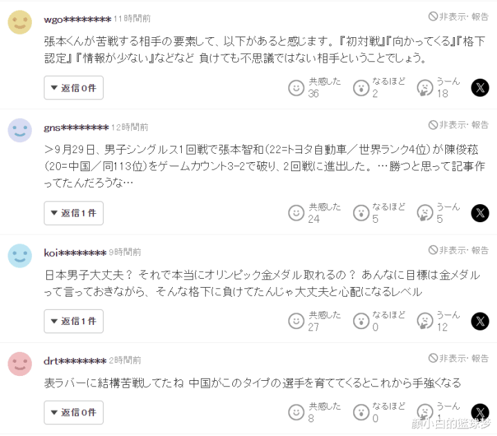 日乒男单世界排名第四的张本智和选手在北京大满贯首轮游,击败他的国乒选手叫做陈俊菘,这是一位名不见经传的小将,他的世界排名只有113,两人在世界排名差距如此大的情况下张本被爆冷,这引起了日本球迷的热议。