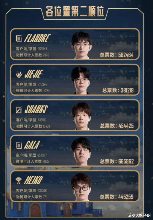 然而比第一阵容更具“戏剧性”的,是第二顺位阵容的结构——全员国产,上单Flandre、打野Jiejie、中单Shanks、下路GALA、辅助Meiko,如同被整齐摆放在第二梯队,一个极端是韩援统治,一个极端是国产打包,这种鲜明对比也让不少人质疑:观众的投票到底是在表扬谁的表现,还是在投自己情绪?