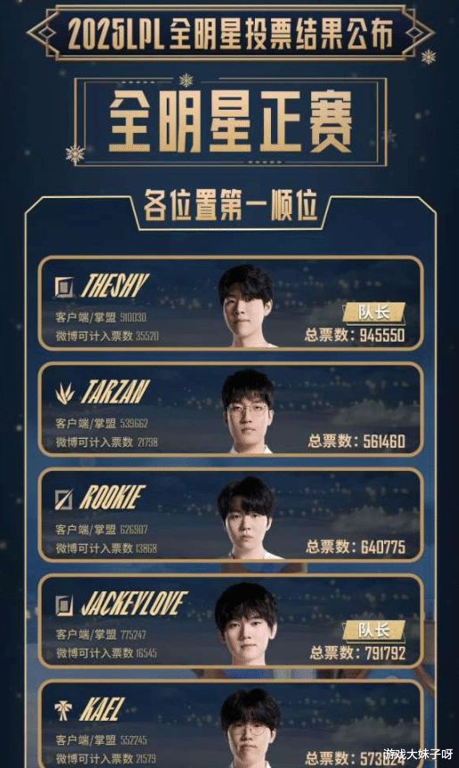 中单Rookie拿下63万票同样毫无悬念,多年征战LPL的深厚人气依旧稳固,打野Tarzan与辅助Kael更是本次最大的惊喜,55万与56万票证明了只要在世界赛打出足够亮眼的表现,即使粉丝体量不大,也一样能赢得认可,AD位置上,JackeyLove以78万票成为唯一跻身第一阵容的本土选手,在韩援包围之下显得尤为亮眼。
