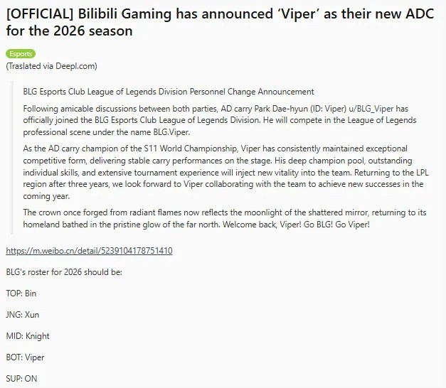 BilibiliGaming已宣布‘Viper’将作为他们2026赛季的ADC。