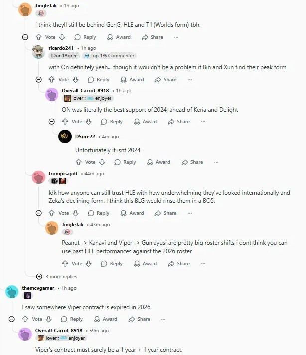 Peanut->Kanavi和Viper->Gumayusi是相当大的阵容变动,我认为你不能用过去的HLE表现来评价2026年的阵容。