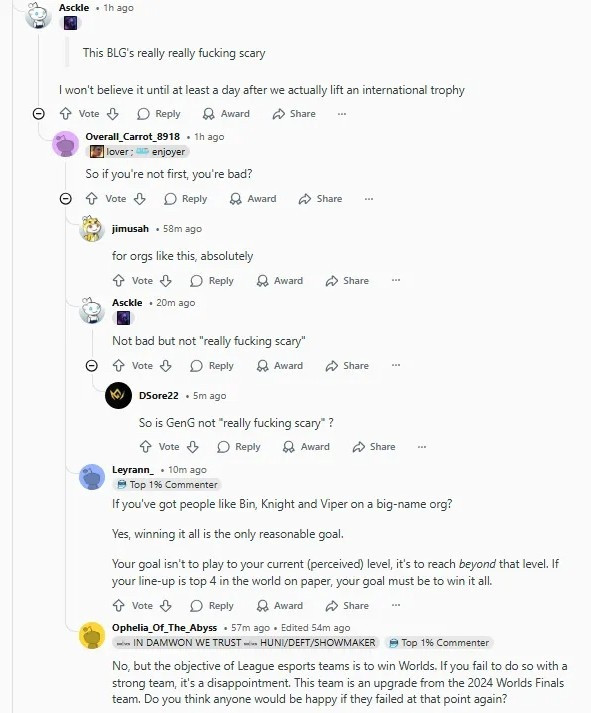 不,但是英雄联盟电竞队伍的目标是赢得世界赛。如果你用一支强大的队伍未能做到这一点,那就是令人失望的。这支队伍是2024年世界赛决赛队伍的升级版。你认为如果他们再次失败,会有人高兴吗?