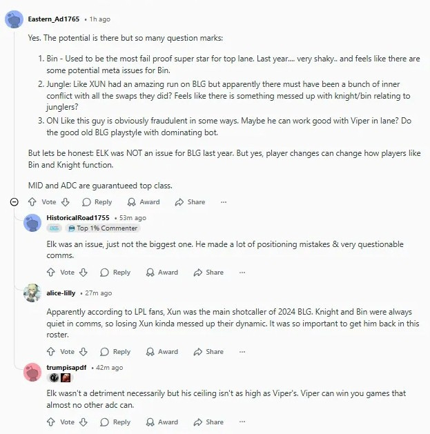 Elk是BLG最不构成问题的一环,但如果Viper可用,那就选Viper。考虑到他的中文基本上是母语水平,他应该能完美融入队伍。