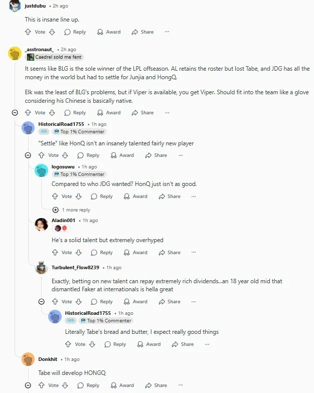 看来BLG是LPL休赛期的唯一赢家。AL保留了阵容但失去了Tabe,而JDG拥有世界上所有的钱,却不得不将就Junjia和HongQ。